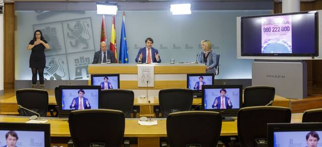 El presidente de la Junta, Alfonso Fernández Mañueco, junto al vicepresidente Francisco Igea y la consejera de Sanidad, Verónica Casado, informan de forma telemática de las medidas de la crisis del coronavirus / AGENCIA ICAL