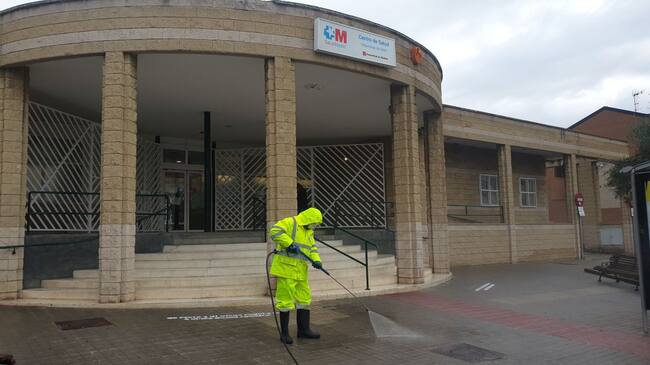Tareas de desinfección en los exteriores del centro de salud de Villaviciosa de Odón / Ayuntamiento de Villaviciosa de Odón