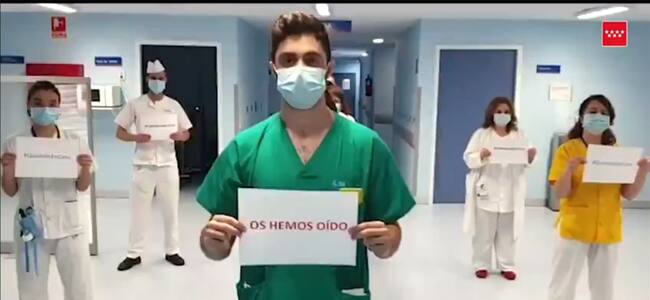 Tras los apoyos y aplausos ciudadanos que han surgido en los últimos días para alentar al personal de los hospitales que se deja la vida para tratar a los enfermos más graves de coronavirus, los trabajadores hospitalarios han sacado unos segundos para devolver el gesto y comprometerse a seguir luchando para garantizar la salud de todos. Es el caso del Hospital Severo Ochoa de Leganés, que junto al área de Salud de la Comunidad de Madrid han difundido un emotivo vídeo en el que la música de fondo y los aplausos son los únicos sonidos.