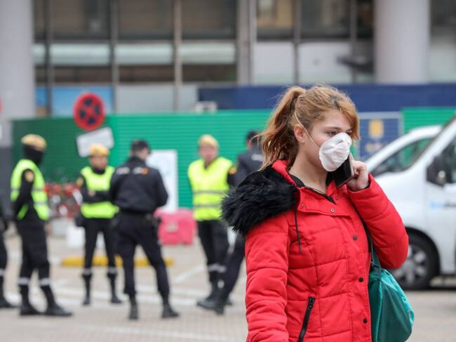 Una mujer con mascarilla circula cerca de donde se concentran efectivos de la Policía Nacional y del UME en las inmediaciones de la estación de tren Puerta de Atocha.