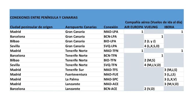 Así, la Orden limita la conectividad para todas las compañías aéreas entre cualquier aeropuerto situado en territorio nacional y los situados en el territorio de canarias según el siguiente esquema: