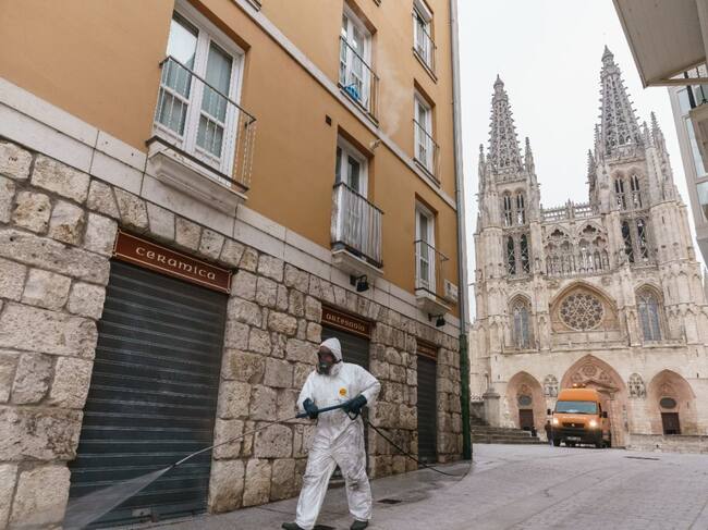 Operario realizando labores de desinfección en el entorno de la Catedral. / Ayuntamiento Burgos