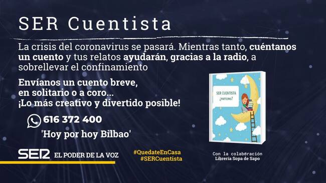 En este caso, lo hemos querido enfocar hacia los más pequeños que son los que quizá más puede costarles sobrellevar la cuarentena. A falta de parque, les ofrecemos la radio. SER Cuentista, en todo caso, es una pequeña aportación, con la colaboración de la librería Sopade Sapo de Bilbao,  para ellos y también para que toda la familia pueda disfrutar creando un breve relato en formato de radiocuentos.