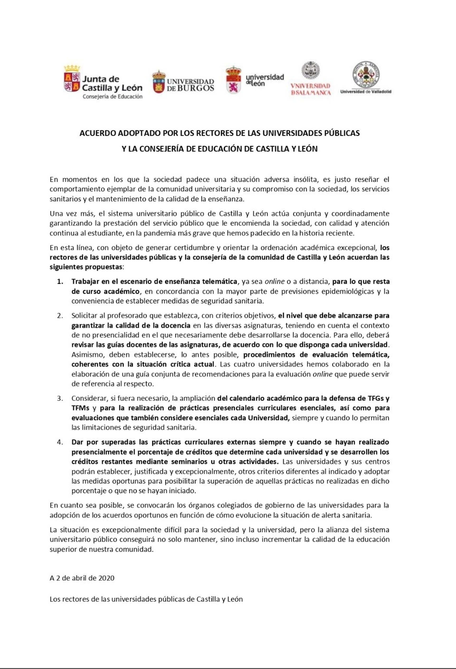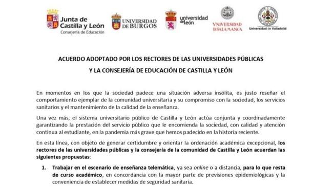 En un comunicado conjunto de las instituciones académicas de Salamanca, Burgos, León y Valladolid, junto a la Consejería de Educación de la Junta de Castilla y León, han dado a conocer el acuerdo para mantener la formación "ya sea online o a distancia" durante el presente curso.