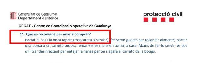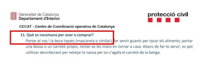 No obstant això, a causa de l'escassetat de màscares, guants i un altre tipus de material de protecció sanitari, la Generalitat suggereix usar "qualsevol mitjà que tinguem disponible" per tapar-se la boca i el nas en sortir a comprar i recorda diversos mètodes per fabricar mascaretes casolanes.