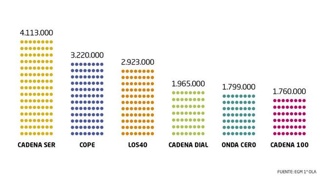 La Cadena SER aventaja en 893.000 oyentes diarios a la segunda cadena en el ranking, la COPE con 3.220.000 oyentes. La tercera emisora más escuchada en España es LOS40 con 2.923.000 oyentes, seguida de Cadena Dial con 1.965.000 oyentes. En quinta posición, se sitúa Onda Cero con 1.799.000 oyentes, 2.314.000 oyentes menos que la Cadena SER.