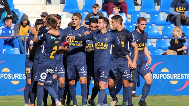 La plantilla universitaria celebrando un gol / UCAM Murcia CF