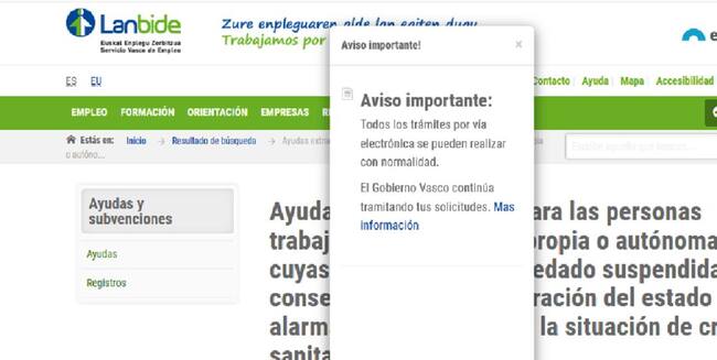 Aviso en la web de Lanbide al acceder a la página de las ayadas / Lanbide.eus