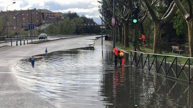 Los bomberos tuvieron que retirar las rejillas de desagüe para aliviar las grandes bolsas de agua que se habían formado en el puente de la calle Orégano, bajo la vía del tren, o en Calderón de la Barca y tuvieron que achicar el agua en la entrada por la A-40, junto a la Gerencia de Urbanismo.