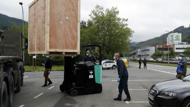 Miembros del ejército y personal del la empresa Bexen Medical, en la localidad vizcaína de Etxebarria, durante la descarga de tres máquinas procedentes de China, que fabricarán mascarillas para el Ministerio de Sanidad. / Luis Tejido (EFE)