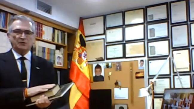 En vez de estar en el salón de plenos los concejales han seguido la sesión por internet desde sus casas. Alberdi estaba en su despacho y ha aprovechado para preparar cuidadosamente la escena. En la imagen se le veía vestido de traje, con corbata negra. En la mano llevaba dos publicaciones y es que ha jurado el cargo sobre un ejemplar de la Constitución y una Biblia.