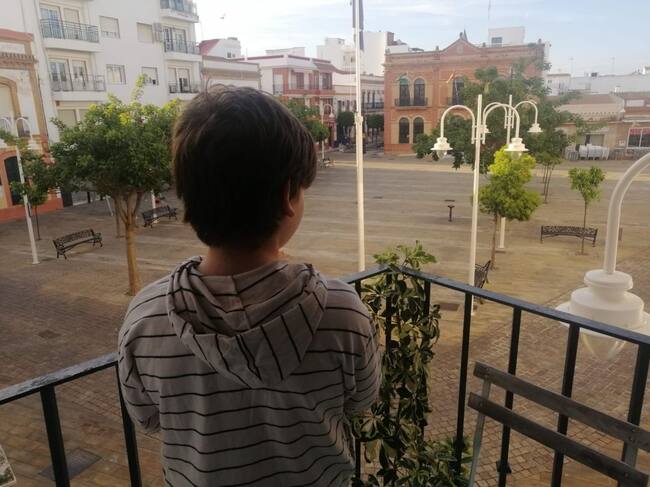 Marcos (9 años), mira la plaza desde el balcón de su casa donde lleva casi 40 días sin salir por el confinamiento / cadena ser