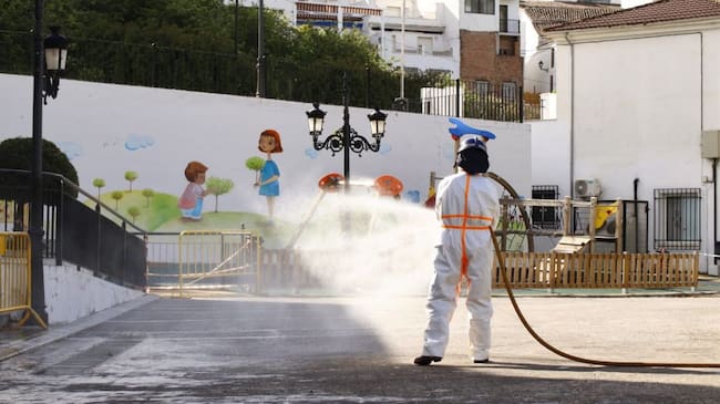 Un operario del Infoca desinfecta una plaza pública en Serrato / Cadena SER