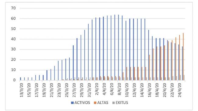 Sí se han registrado dos nuevas altas médicas por lo que, tras un total de 46 personas recuperadas y cinco fallecimientos, los casos activos siguen reduciéndose hasta llegar en estos momentos a los 33. En este sentido, continúa la dinámica descendente iniciada ya hace días.