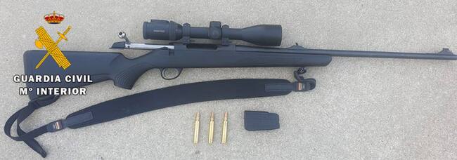 Trascurrida más de una hora de espera, ya con apenas luz diurna, los guardias civiles divisaron una persona que salía caminando del monte y se dirigía hacia el vehículo. Sobre el hombro portaba un arma larga y transportaba también una mochila y unos prismáticos colgados del cuello. Fue interceptado a la altura del vehículo y tras un somero registro a su interior, fue localizado, tapado bajo una chaqueta y una mochila, un rifle de caza del calibre 300 WM, provisto de un visor. El arma se encontraba fuera de su funda y estaba municionada ya que portaba tres cartuchos del referido calibre, dos de ellos en el cargador y un tercero alojado en la recámara, por lo que estaba dispuesta para su uso.