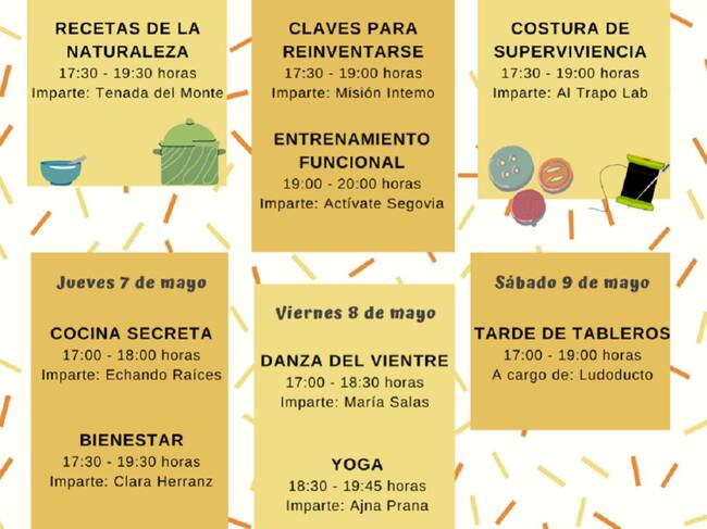 Las actividades propuestas son de temáticas tan variadas como cocina, baile costura de supervivencia, bienestar físico, mental y emocional, ejercicio físico... y son impartidas por profesionales de Segovia.