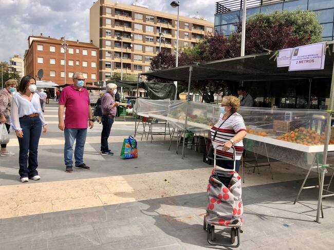 La clientela ha entrado con distancia de seguridad entre compradores, ha recibido gel desinfectante y mascarilla quirúrgica en caso de no llevarla puesta. Las diferentes paradas se han extendido a lo largo de la explanada de la plaza de España y la avenida José Ortiz desde la confluencia con San Pascual.