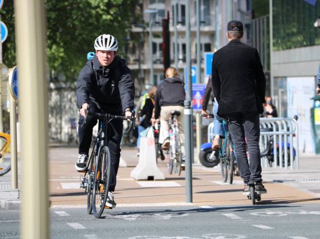 Pla mitjà d'un ciclista i un noi en patinent circulant pel centre de Brussel·les durant la primera setmana de desconfinament, el 5 de maig del 2020. (Horitzontal) / Natàlia Segura (ACN)