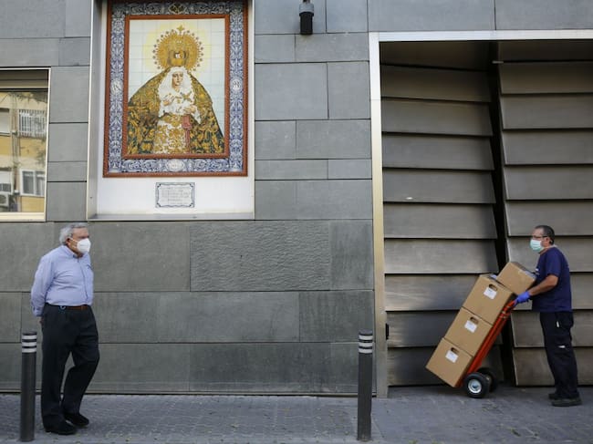 Un hombre con mascarilla pasea por Sevilla, cerca, otro hombre descarga cajas de material también debidamente protegido / Marcelo del Pozo (Getty Images)