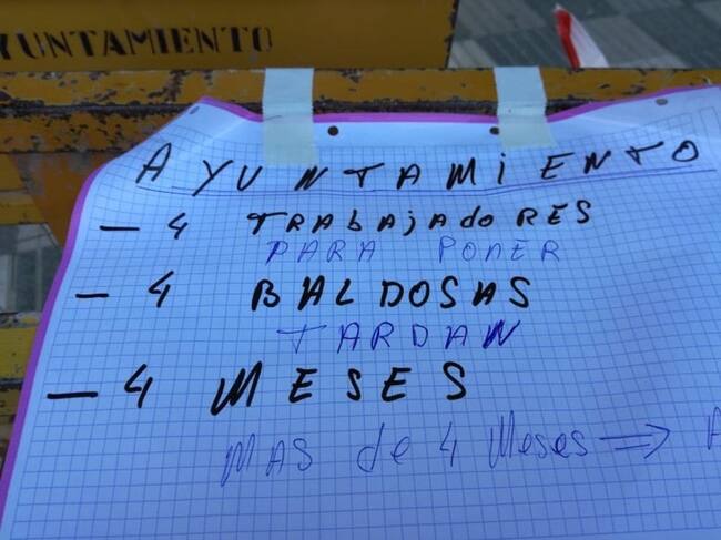 Con una letra un tanto rústica, en la nota se puede leer en una hoja cuadriculada: "Ayuntamiento 4 trabajadores para poner 4 baldosas tardan 4 meses". Puestos en contacto, desde la Escuela Taller que realiza los trabajos recuerdan que no es cierto que se esté tardando cuatro meses sino trabajos. Son unos trabajos muy complicados, de cierta precisión, de los que se encarga fundamentalmente una persona, el monitor de la Escuela Taller.