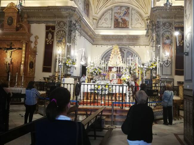 Durante las horas que esté abierta la parroquia se organizará un flujo ininterrumpido de personas, guardando las medidas de seguridad, y teniendo en cuenta las franjas horarias establecidas por el gobierno para salir de casa, con objeto de que todo el que quiera y bajo su responsabilidad, acceda al interior del templo a saludar a la Virgen, sin sentarse.