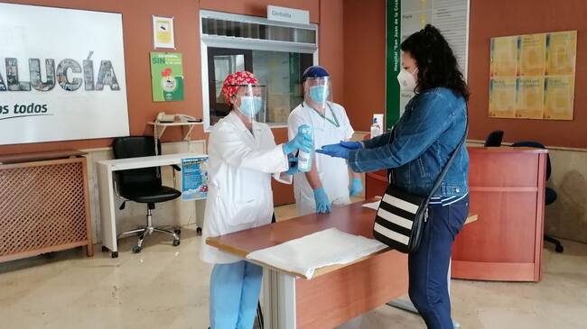 Auxiliares de enfermería proporcionan gel hidroalcohólico a la entrada del hospital de Úbeda / Junta de Andalucía