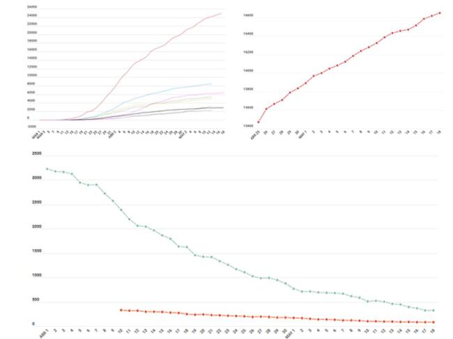 Las personas curadas en abril fueron más que ahora porque había más contagiados, promediando más de 200/día a mediados de abril (unos días después de los de mayores contagios). Ahora se promedian en torno a 30 por jornada, 6.392 en total, todavía le queda andadura a nuestra línea rosada para alcanzar al número total de contagiados en la frontera de los 25.000 aproximadamente (Sanidad ha dejado de dar datos de contagiados totales y solo da positivos por PCR).