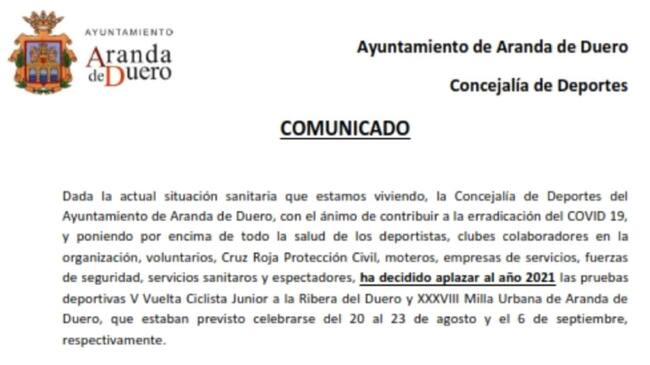 Este es el comunicado emitido por el área de deportes del Ayuntamiento de Aranda de Duero anunciando el aplazamiento de ambas pruebas: