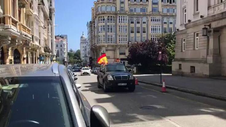 La manifestación contra la "nefasta gestión" del gobierno en la crisis del coronavirus y para pedir la dimisión del presidente Pedro Sánchez ha pasado por la ciudad de A Coruña. Decenas de vehículos con banderas de España han recorrido varias calles del centro del casco urbano tras salir desde la explanada del estadio de Riazor a mediodía.