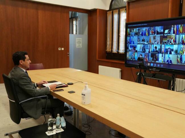 El presidente de la Junta, Juanma Moreno Bonilla, durante la reunión telemática de presidentes regionales con el presidente del Gobierno, Pedro Sánchez