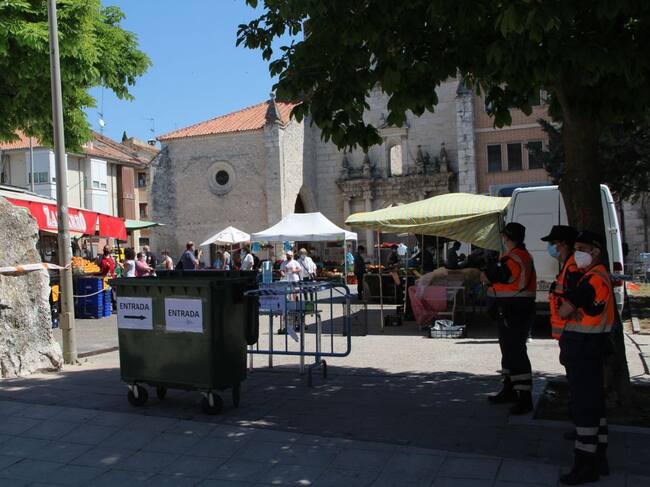 El tradicional mercado de los jueves ha regresado a Cuéllar en la explanada de la Soledad con los puestos de frutas, plantas, encurtidos o bacalao. Tan solo dos puestos de los que habitualmente integran los puestos de alimentos de primera necesidad no han acudido en esta primera jornada, un frutero y un puesto de pollos asados. Desde primera hora la Policía Local ha vallado la zona separando la zona de entrada y salida con un contenedor e instalando una mesa con gel hidroalcohólico en la entrada. Además varios miembros de Protección Civil han orientado a los vecinos que han acudido hasta el mercado y han entregado mascarillas a todos aquellos que no las portaban.