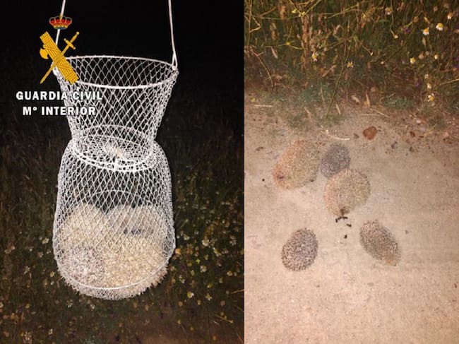Seguidamente la Guardia Civil inspeccionó el interior el vehículo y descubrió que bajo uno de los asientos había un retel con cinco erizos comunes (Erinaceus europaeus), especie que actualmente se encuentra dentro del Catálogo Regional de Especies Amenazadas de Castilla-La Mancha, como especie de interés especial por su interés científico, ecológico y por su singularidad. Los agentes también hallaron cuatro perros de caza en el maletero, los cuales habían sido utilizados para capturar esta especie protegida.