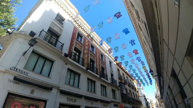 La céntrica calle Tetuán aparece engalanada con camisetas de los equipos de Primera, en especial del Sevilla y del Betis, anunciando así el derbi