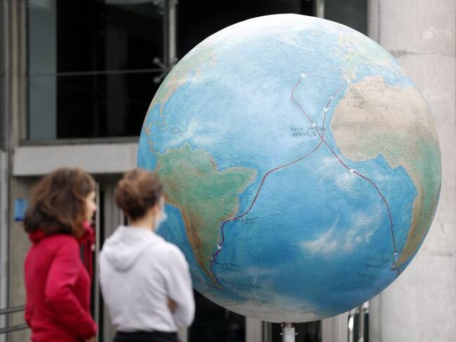 Dos personas observan la bola del mundo con sus océanos en Bilbao, donde este lunes se celebra el Día Mundial de los Océanos. / Luis Tejido (EFE)