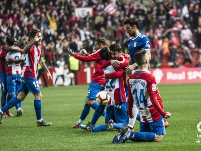 Los jugadores del Sporting celebran la victoria en el último derbi en El Molinón / La Liga