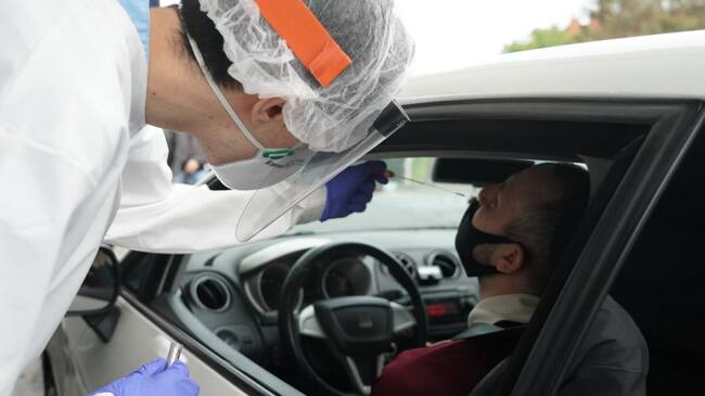 Un trabajador sanitario le realiza un test desde un vehículo a un hombre.