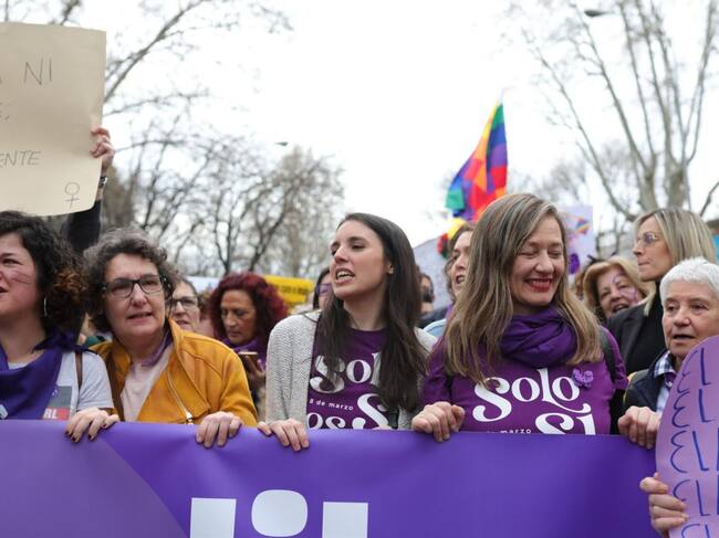 La ministra de Igualdad, Irene Montero (centro), en la manifestación del 8M (Día Internacional de la Mujer), en Madrid a 8 de marzo de 2020. (Jesús Hellín - Europa Press)