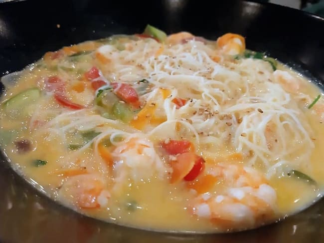 Wok de fideos de arroz con langostinos, verduras y leche de coo / A Boca Llena