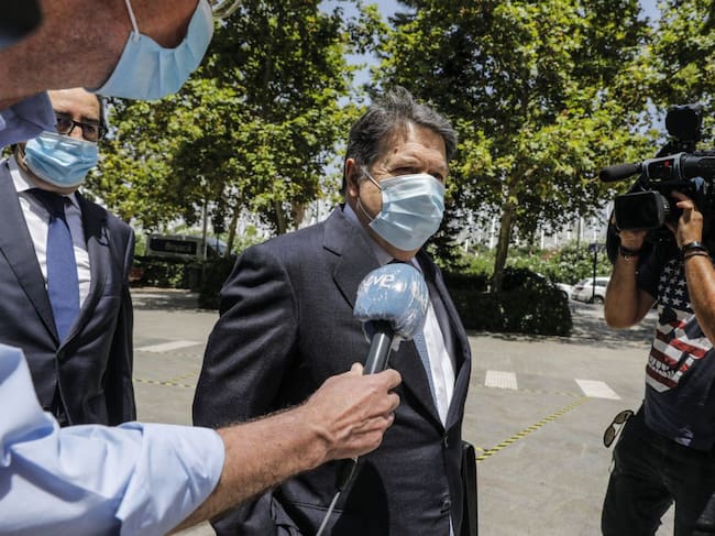 El expresidente de la Generalitat valenciana y exvicepresidente de Bankia José Luis Olivas, rodeado de medios de comunicación a su llegada al Juzgado número 8 de Valencia - que instruye presuntos sobornos a cambio de adjudicaciones de las ITV y el Plan Eólico Valenciano-, en Valencia, Comunidad Valenciana (España), a 30 de junio de 2020. Olivas será juzgado por la presunta trama de Erial por la que también se investiga al expresidente de la Generalitat y exministro de Trabajo con el PP Eduarzo Zaplana por supuesta prevaricación, malversación y blanqueo. / Rober Solsona (Europa Press)