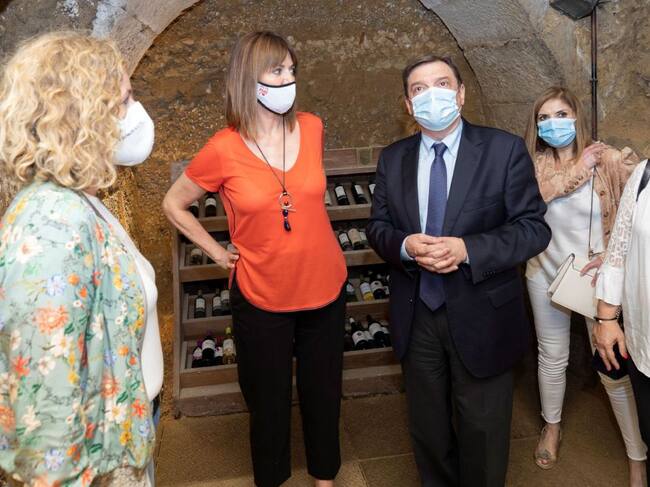 La secretaria general del PSE-EE y candidata a lehendakari, Idoia Mendia (c), junto al ministro de Agricultura, Pesca y Alimentación, Luis Planas (d), y a la dirigente socialista de Álava, Cristina González (i), visitan una cueva donde se guarda el vino en la localidad de la Rioja Alavesa de Laguardia. / Adrián Ruiz de Hierro (EFE)