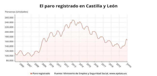 El número de parados inscritos en las oficinas de Empleo de Castilla y León cayó en 4.811 personas en junio con lo que la cifra de desempleados en la Comunidad baja de la barrera de los 170.000 que alcanzó en mayo y se sitúa, en concreto, en 165.481, según los datos del Ministerio de Trabajo y Economía Social .