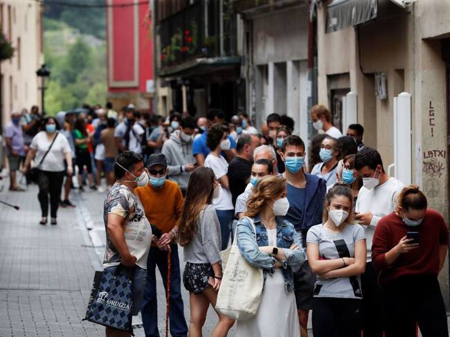 Vecinos de Ordizia (Gipuzkoa) hacen cola este lunes para acudir a las carpas instaladas para realizar pruebas PCR a todas las personas que hayan pasado por los locales de hostelería de la calle Etxezarreta desde el 27 de junio, se ha confirmado que durante este fin de semana se han detectado estos 7 positivos y se han realizado pruebas a todos sus contactos estrechos. / Javier Etxezarreta (EFE)