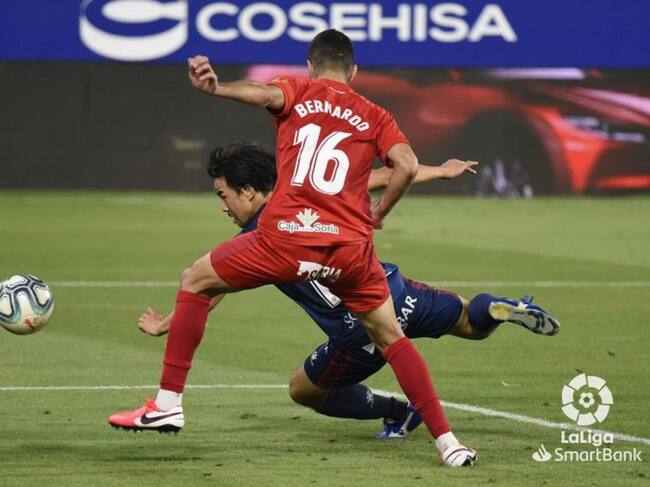 Ambos equipos afrontaban, no tanto una final, sino casi una semifinal, con la posibilidad de, incluso ganando, no poder cumplir el objetivo, al depender de otros resultados, y tener que esperar a la última jornadas. Pero la victoria era importante para los dos. Y empezó movido el partido, con una falta lateral de Curro Sánchez que Adri Castellano cabeceó desviado y la respuesta local con un balón que Iván Calero sacó bajo palos a remate de Josué Sá. El Huesca trataba de llevar la iniciativa, apretando a un Numancia bien plantado. Rafa Mir lo intentó desde la izquierda, pero su remate se marchó lejos del marco soriano. Tardaron los rojillos en volver a acercarse a la portería local y fue con un lanzamiento lejano de Iván Calero que atrapó Álvaro en dos tiempos. Y no cejaba el Huesca en su empeño y tras un par de acciones con los atacantes cayendo en fuera de juego, el nipón Okazaki cabeceó por encima del larguero. Tras el parón no cambió el guión. Otra vez Rafa Mir, esta vez desde la frontal, con un disparo desviado. Dani Barrio empezaba a desquiciar a los atacantes aragoneses, atrapando o repeliendo varios remates de Rafa Mir y Okazaki. Entre medias, Nacho llegó al área local, pero su remate inocente no fue problema para el portero local. Repitió el capitán rojillo antes del descanso, con una volea sin puntería.