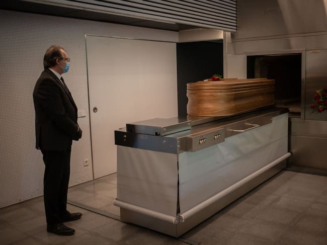 Un miembro de los Servicios Funerarios Memora instantes antes de introducir un ataúd, ya desinfectado, de una víctima con Covid-19, en el horno crematorio. / David Zorrakino (EUROPA PRESS)