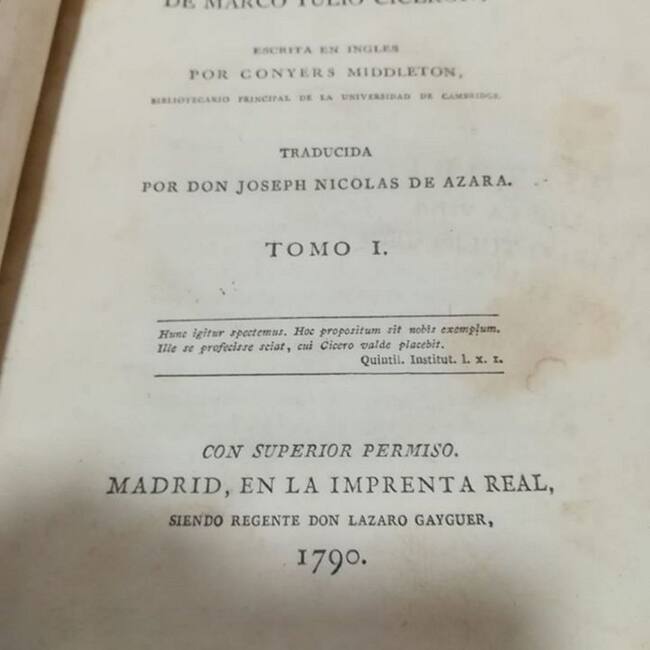 Se trata de "La vida de Marco Tulio Cicerón" un viejo ejemplar que fue editado en el año 1790
