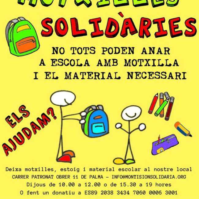 Las campañas "Motxilles Solidàries" y "Cap Infant Sense Jugueta" de la Fundación Monti-sión Solidaria en colaboración con la Federación de Asociaciones de Padres y Madres de Alumnos (FAPA) ha empezado en la red con un vídeo que busca concienciar a las masas. Cuadernos tamaño din A4, cajas de rotuladores y de lápices de 12 unidades, compases, lotes de reglas, mochilas y estuches son el material escolar más demandado.