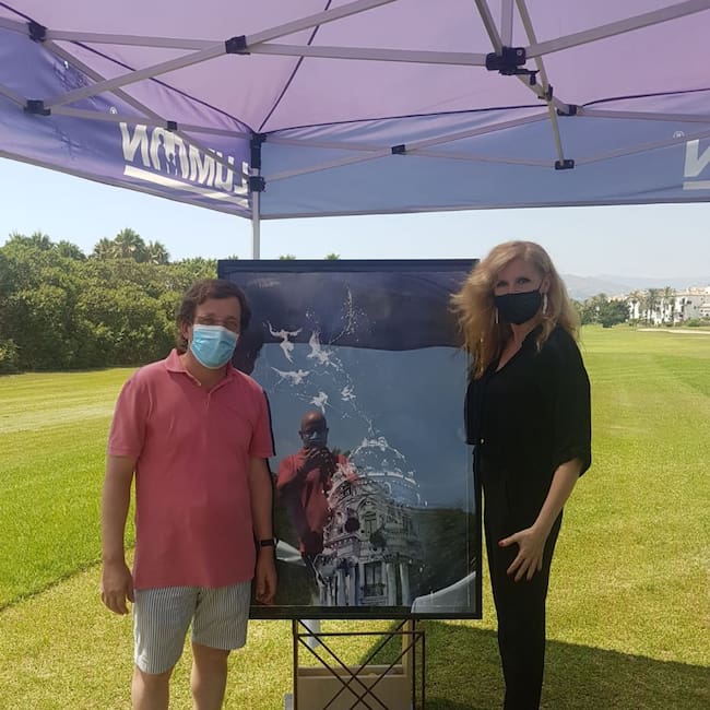 El alcalde de Madrid, Jose Luís Martínez Almeida, junto a la artista motrileña, Mar Aragón, en la entrega de acuarela dedicada a la capital de España en el transcurso del I Trofeo "Homenaje a la Ciudad de Madrid" celebrado en el campo de golf Los Moriscos de Motril / Cadena Ser