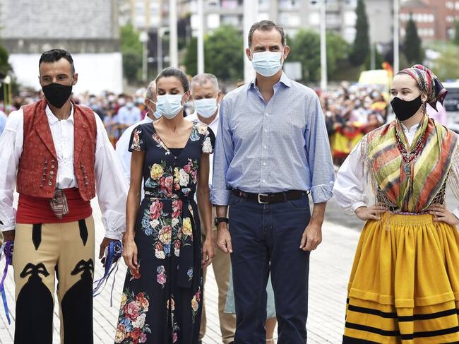 Tanto Felipe VI como doña Letizia -él con camisa azul claro y pantalón del mismo color más oscuro y ella con un mono floreado del mismo color, ambos con mascarilla- han sido recibidos también con la interpretación de una jota montañesa a cargo de la Agrupación de Danzas Virgen de las Nieves de Tanos.