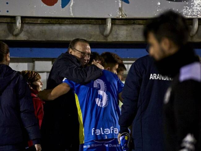 El presidente de la Arandina, Pedro García, se abraza a uno de los jugadores en El Montecillo. / Cadena SER