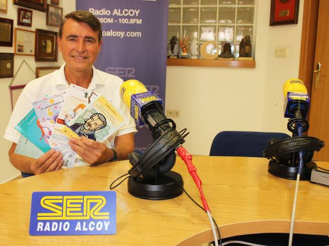 Jordi Raül Verdú mostra els exemplars de les quatre rondalles més el llibre dedicat a Llorenç Giménez / Radio Alcoy